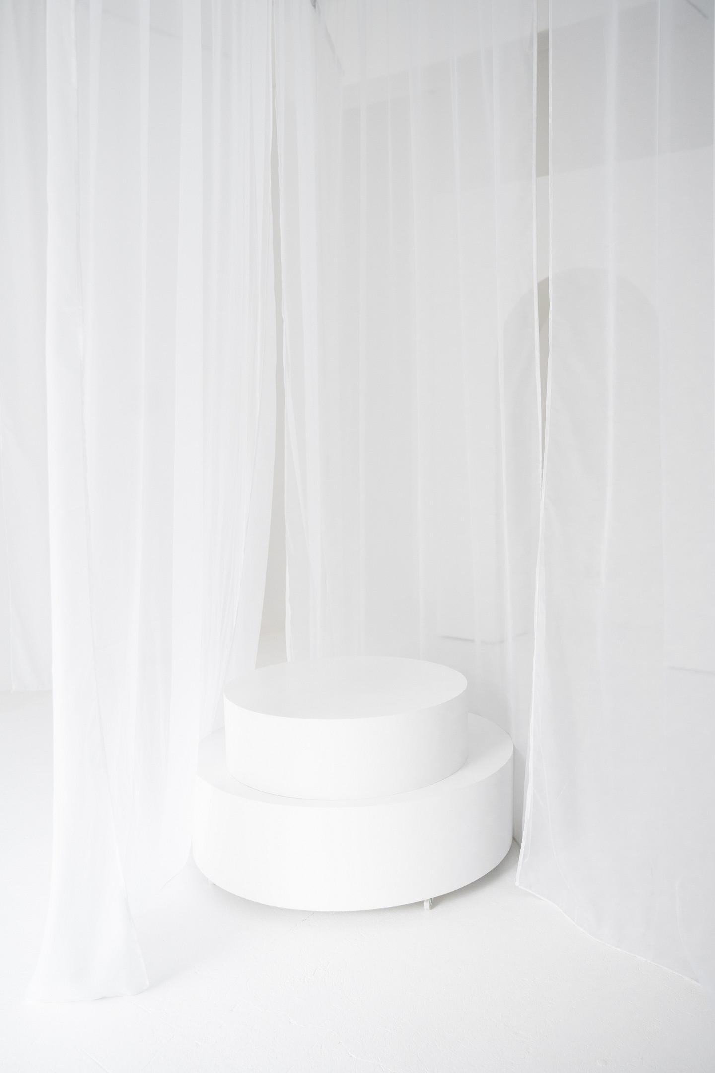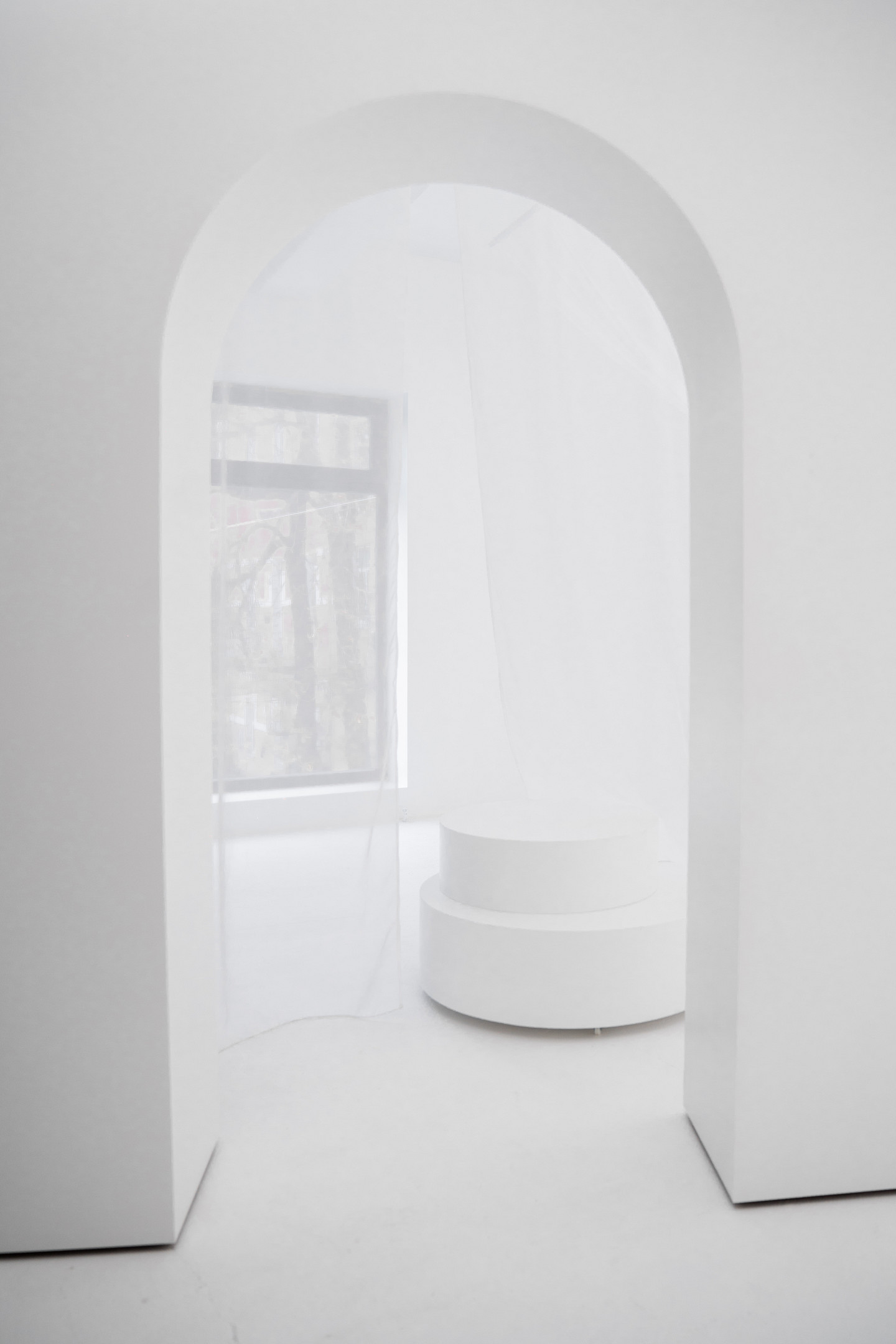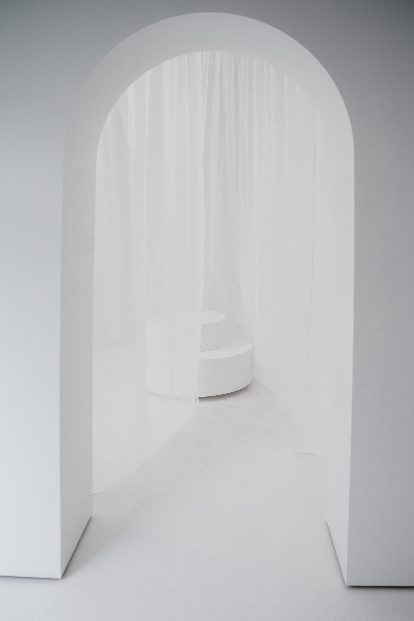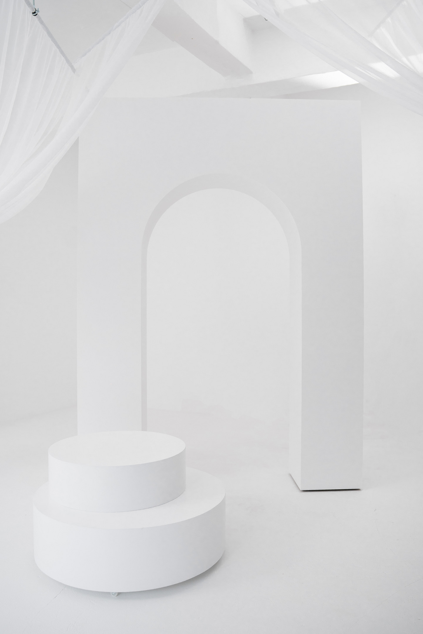 Світла половина — білий кут із мобільними шторами й аркою, які можна пересувати, створюючи простір для мінімалістичних портретів, каталожних зйомок або відео.