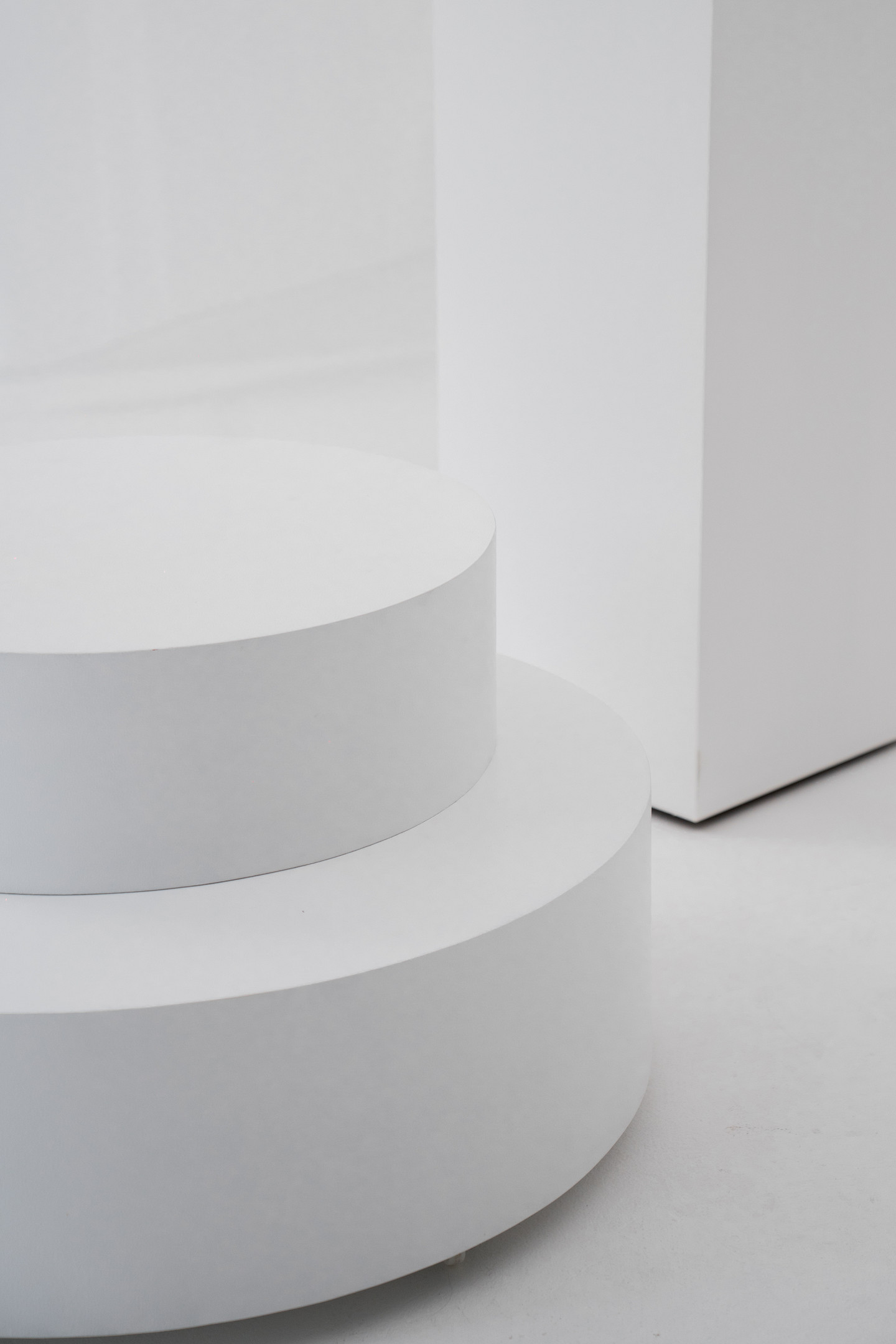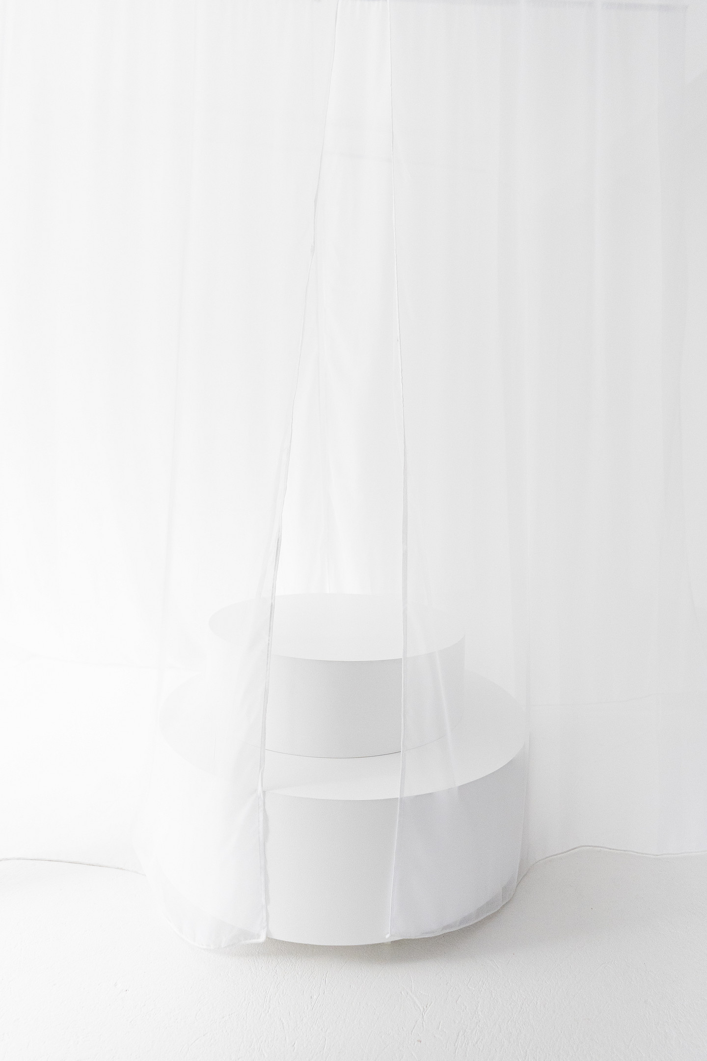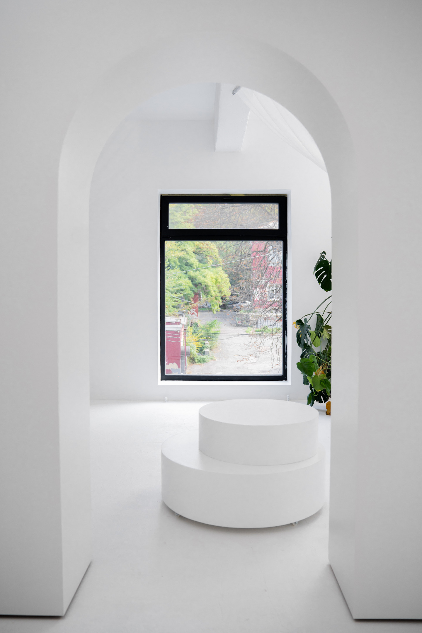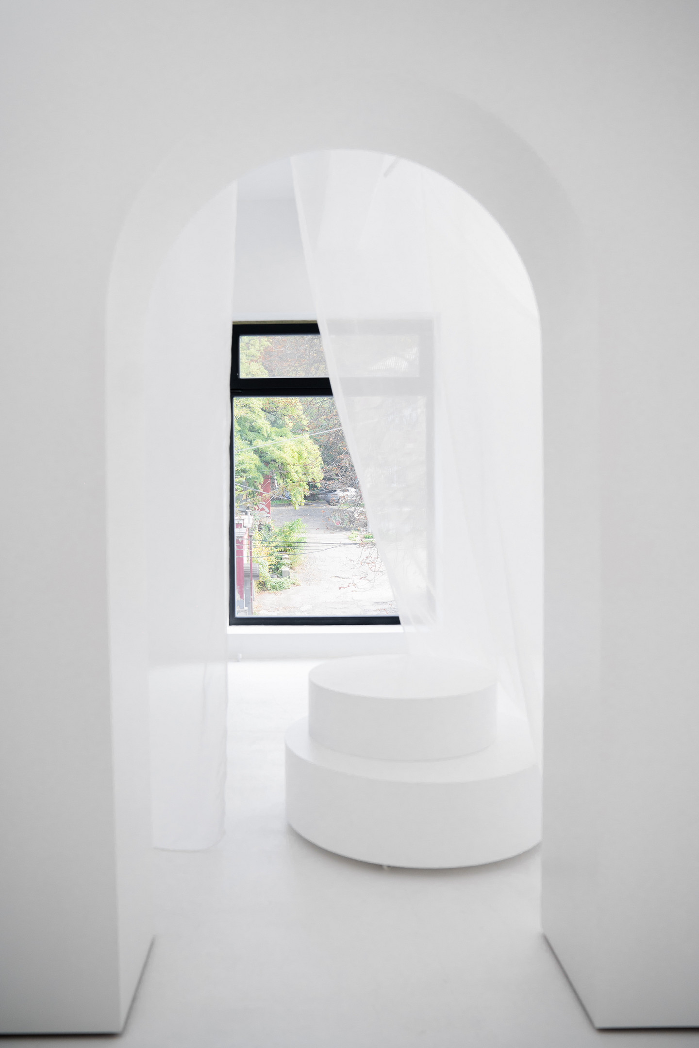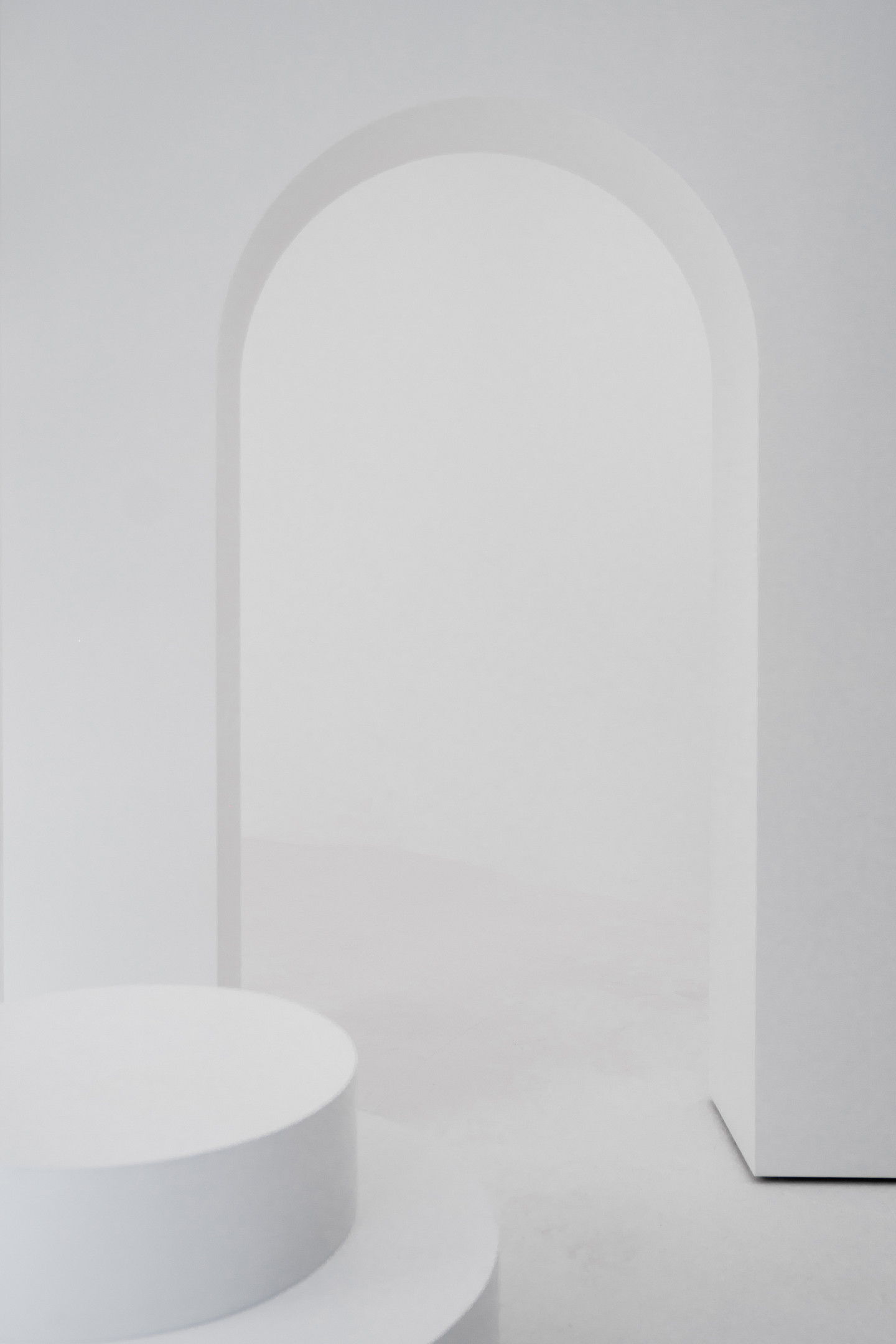 Світла половина — білий кут із мобільними шторами й аркою, які можна пересувати, створюючи простір для мінімалістичних портретів, каталожних зйомок або відео.