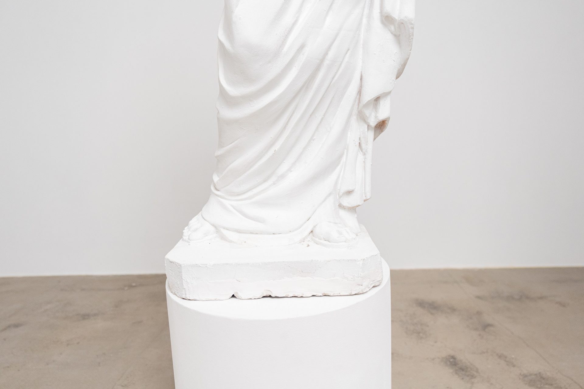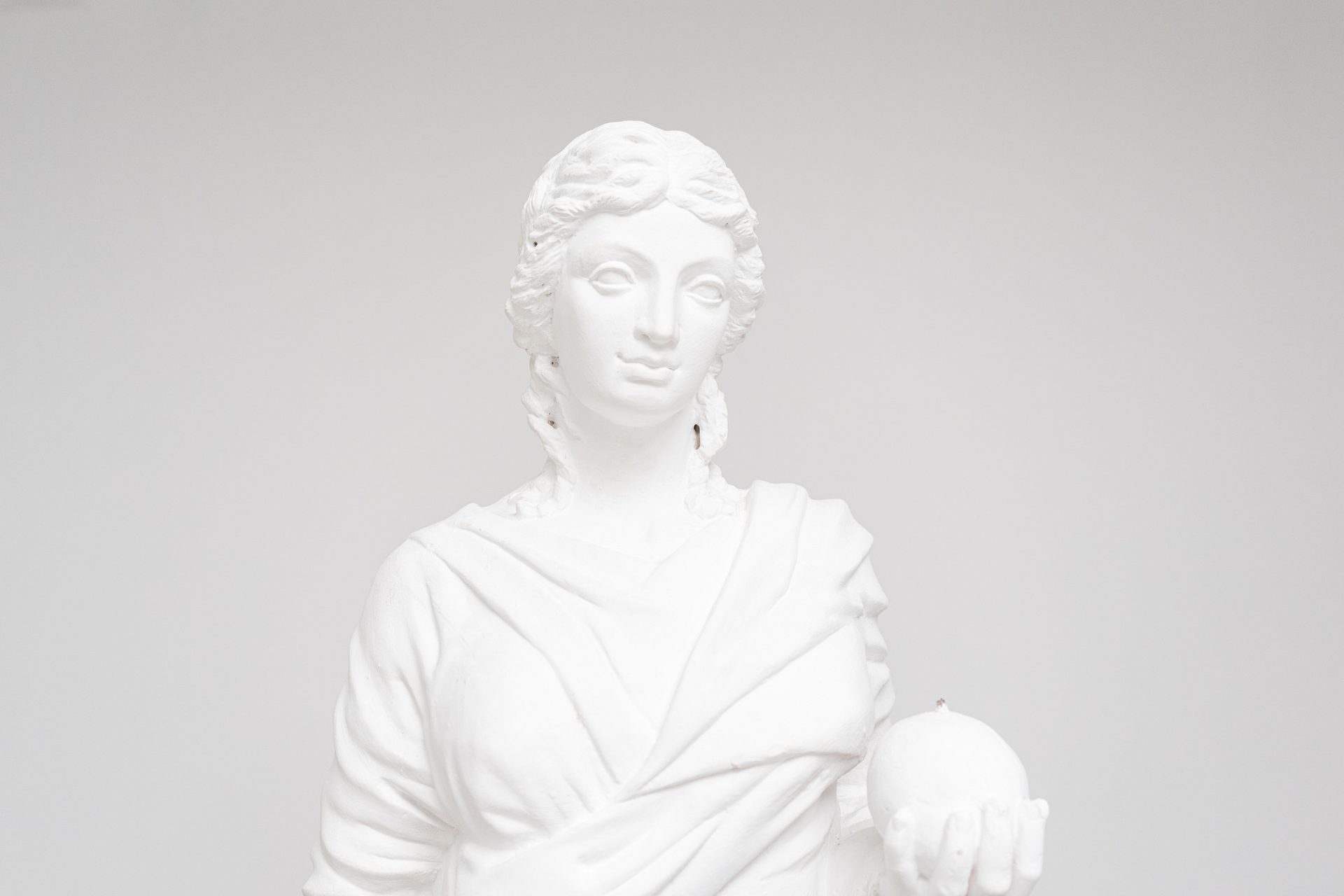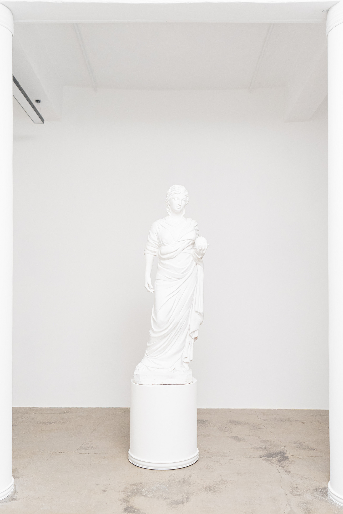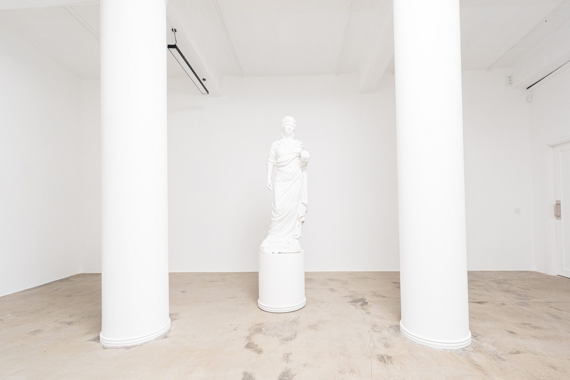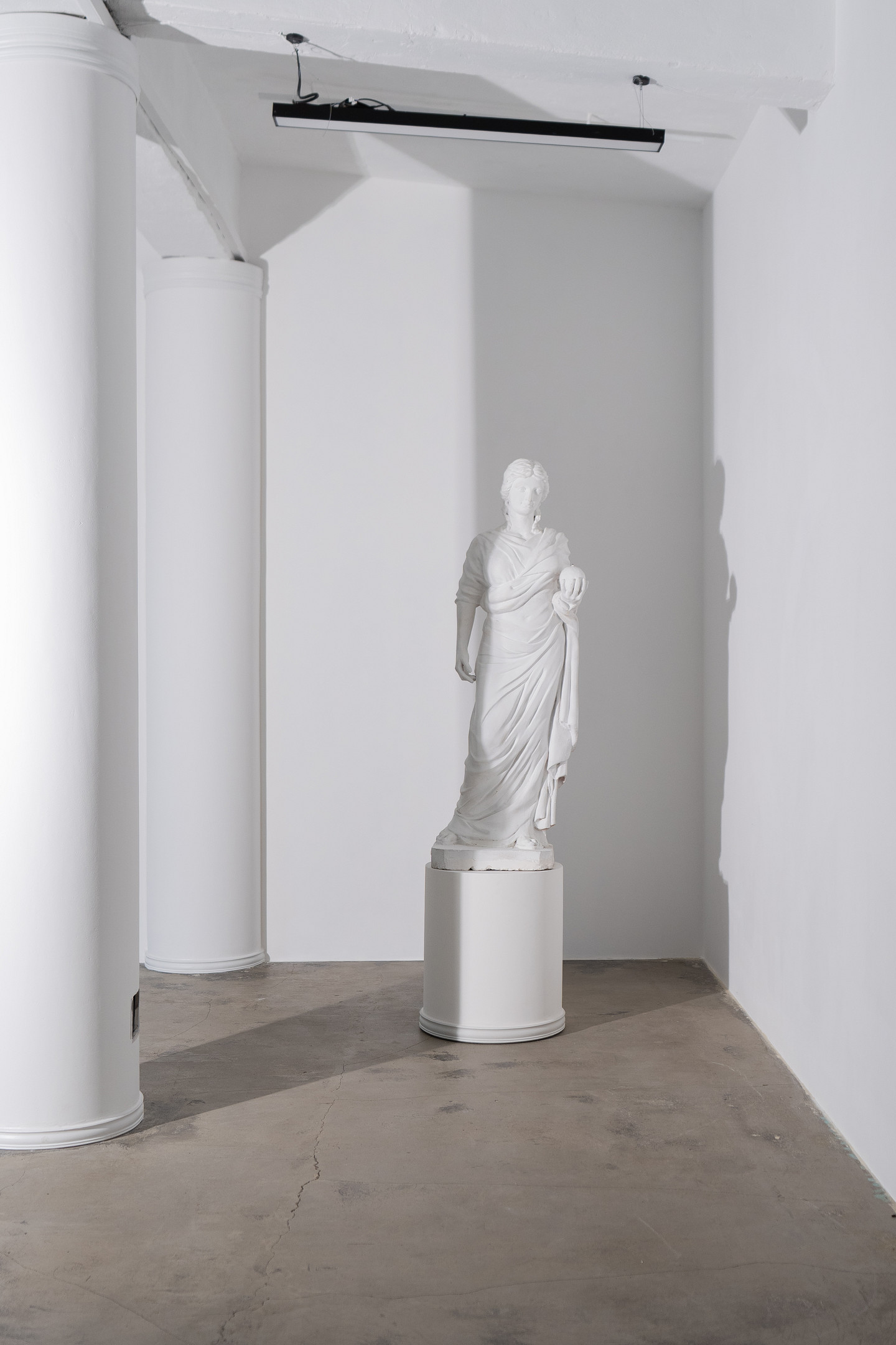 Колони, статуя, білі стіни, мідна стіна, офісна зона