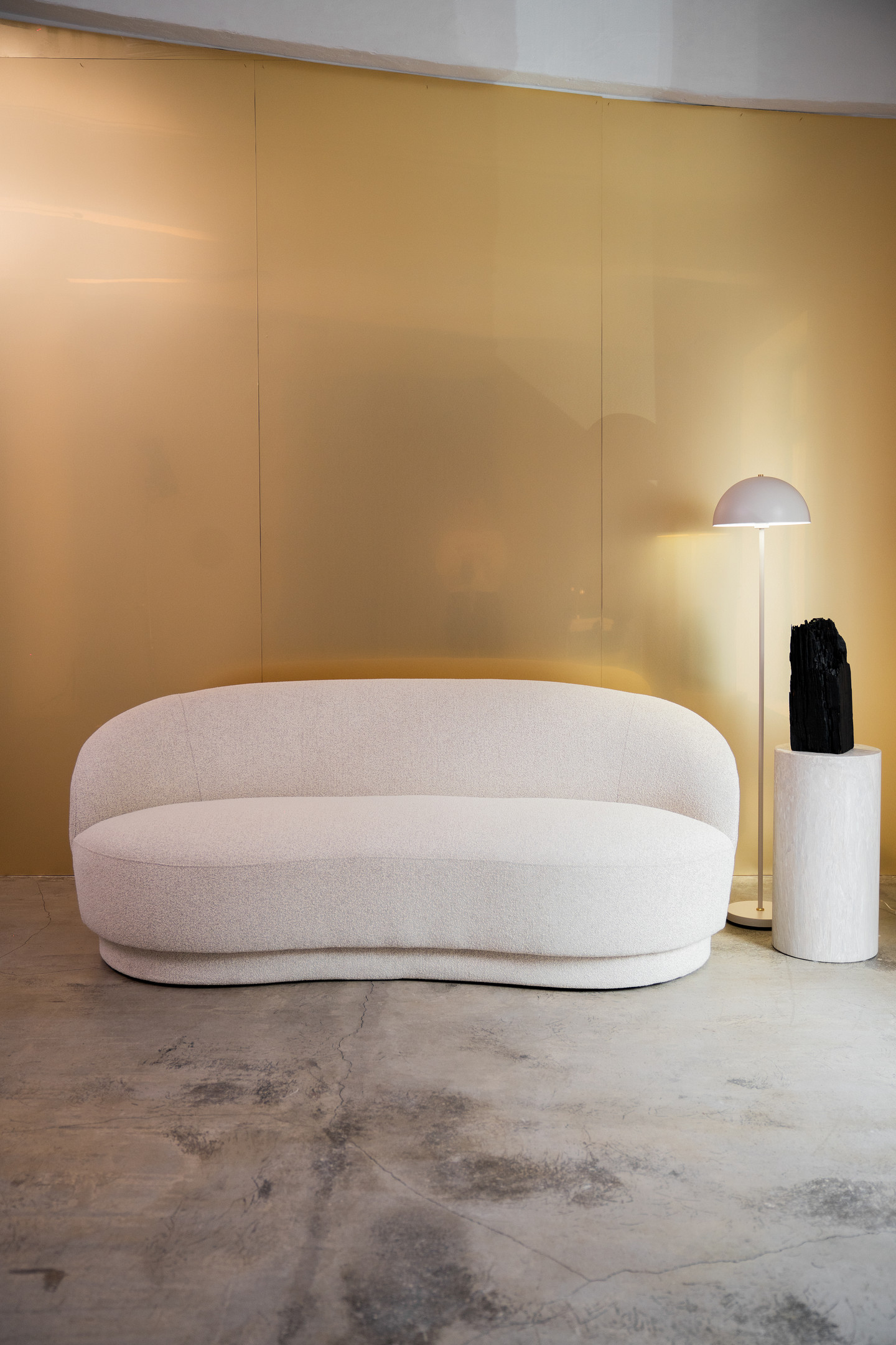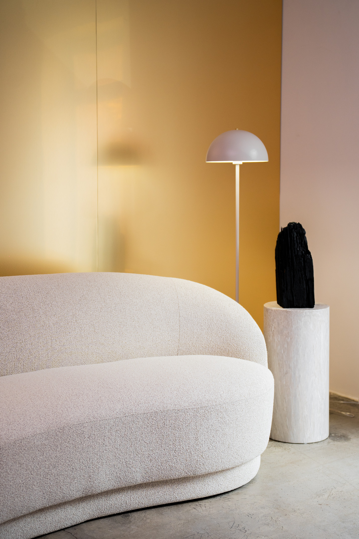 У просторі гармонійно поєднані колони й статуя, що додають драматизму, мідна стіна з диваном і декором — сучасний акцент,