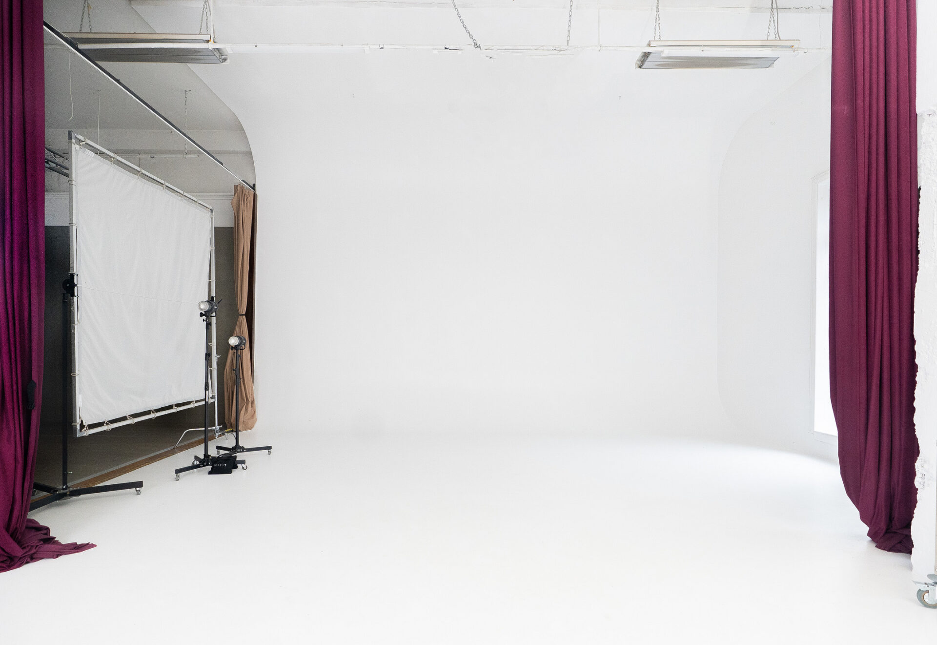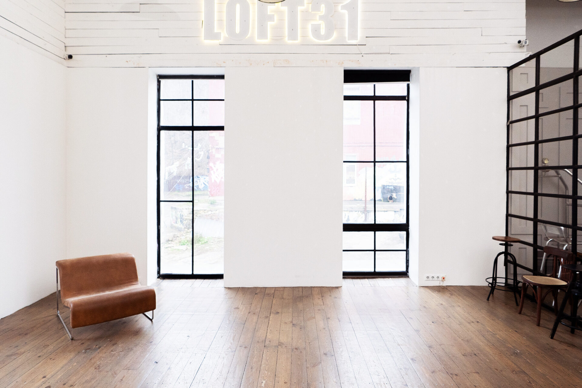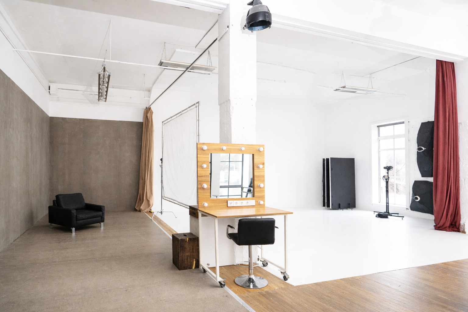 Поєднання естетики індустріального простору з теплом натуральних матеріалів. Великі вікна, фактура бетону і велика біла циклорама відкриває простір для будь-якої ідеї.
